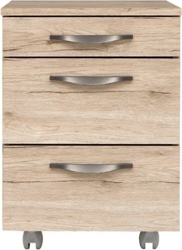 En praktisk skuffeseksjon i eikeimitasjon med 3 skuffer i ulike størrelser og med metallhåndtag. Skuffeseksjonen kan med fordel settes under et skrivebord i samme møbelserie.