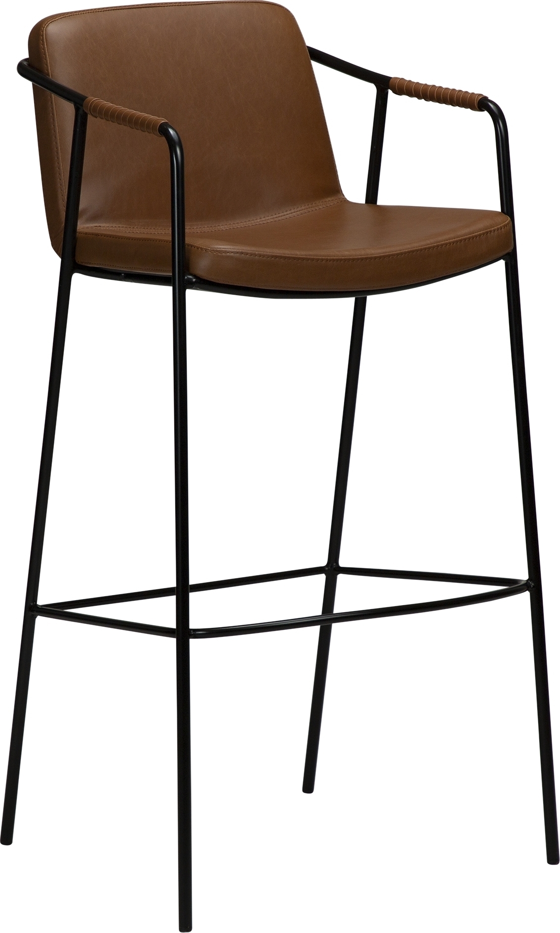 Fin og stilig barstol fra danske Dan-Form. Stolen har en moderne retrostil og gir god sittekomfort. Rammen er laget av sort pulverlakkert metall med sete og rygg i polstret kunstskinn. Skinnet har et lekkert vintage design og armlenene er elegant dekket med samme skinn for å gi armene en finere følelse.