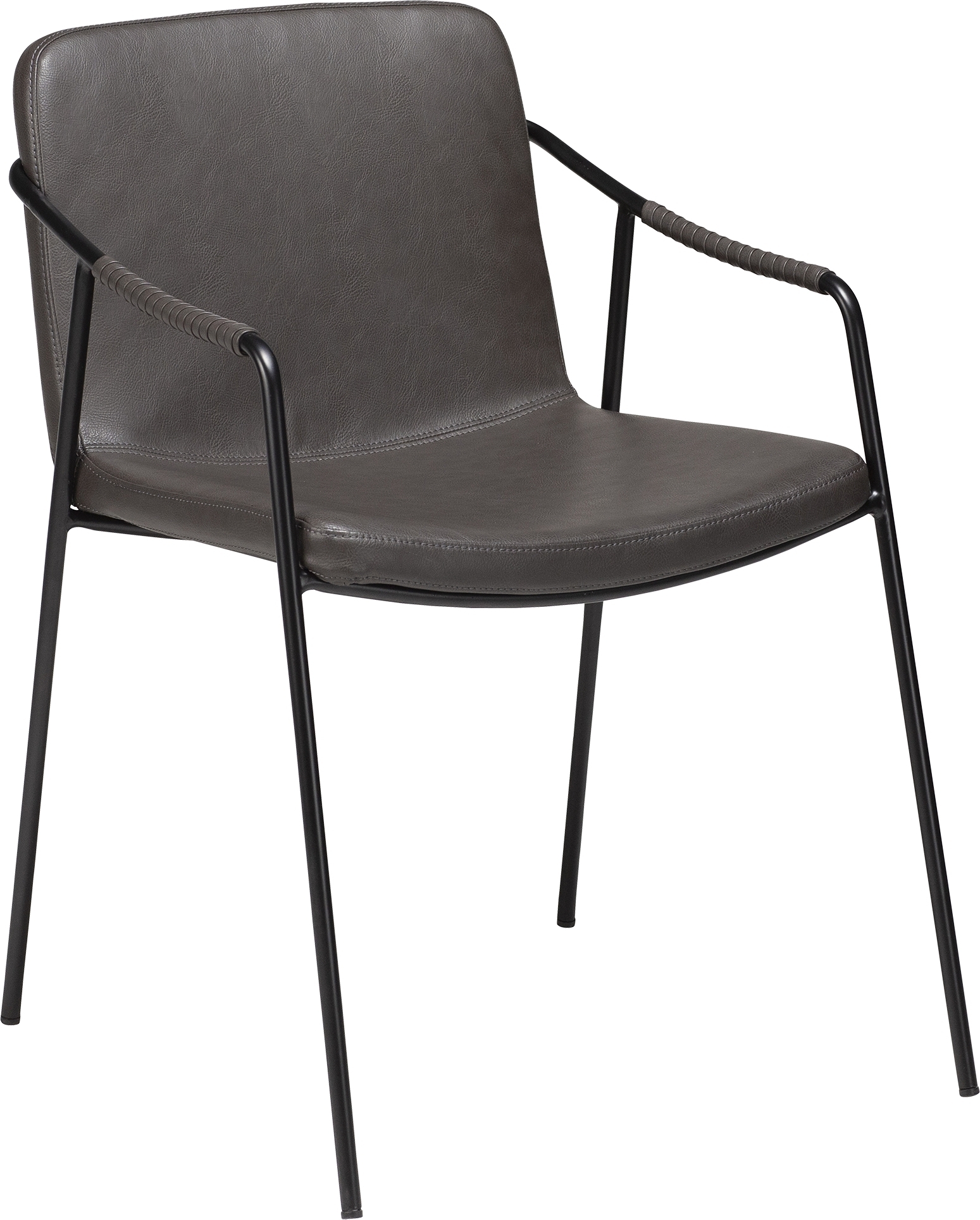 Fin og stilig spisestol fra danske Dan-Form. Stolen har en moderne retrostil og gir god sittekomfort. Rammen er laget av sort pulverlakkert metall med sete og rygg i polstret kunstskinn. Skinnet har et lekkert vintage design og armlenene er elegant dekket med samme skinn for å gi armene en finere følelse.