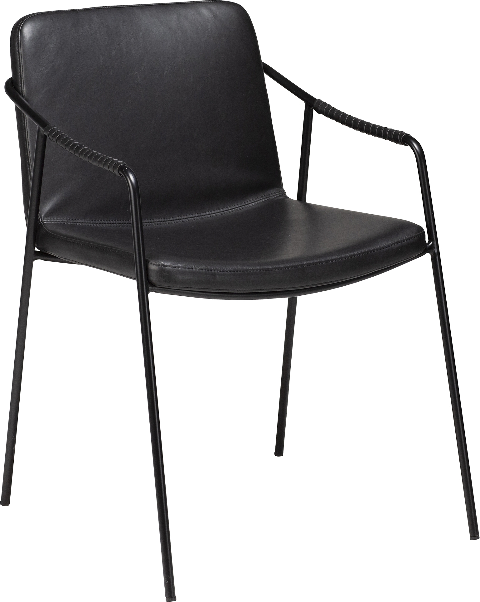 Fin og stilig spisestol fra danske Dan-Form. Stolen har en moderne retrostil og gir god sittekomfort. Rammen er laget av sort pulverlakkert metall med sete og rygg i polstret kunstskinn. Skinnet har et lekkert vintage design og armlenene er elegant dekket med samme skinn for å gi armene en finere følelse.