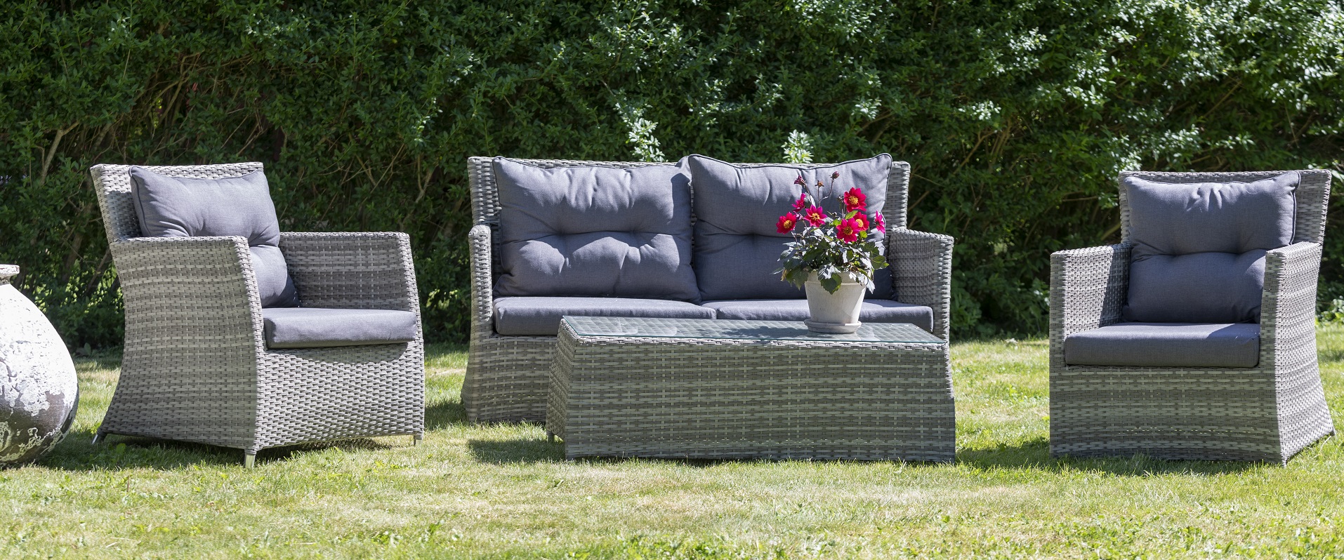 Utemøbelgruppe som inneholder sofa, to lenestoler og et bord. Hele settet er laget av lysegrå kunstrotting med en stabil og værbestandig ramme i aluminium. Bordet har en topplate av herdet glass.