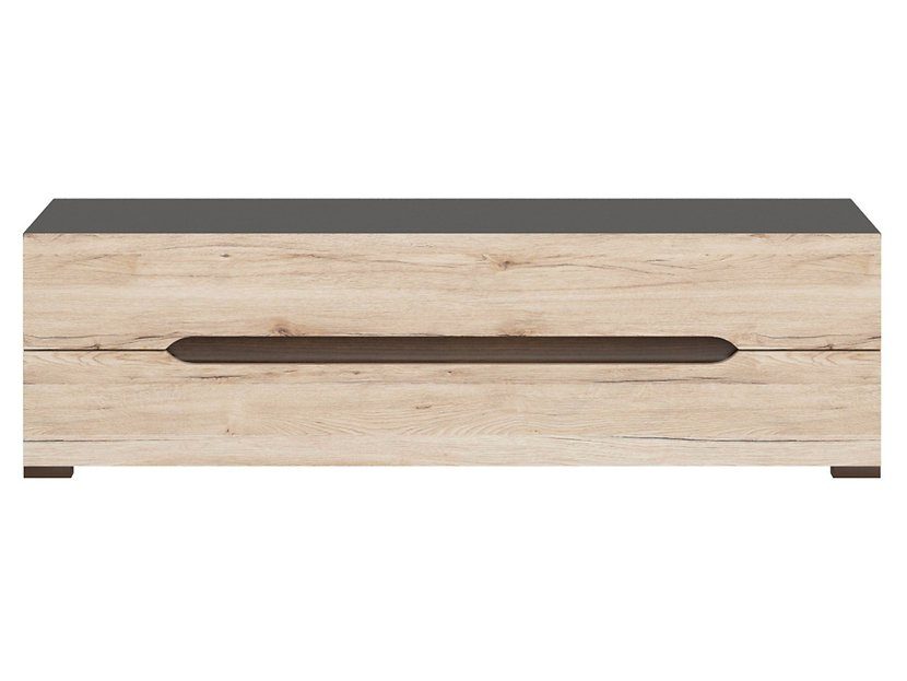 En fin mediabenk i grått med fronter i eikimitasjon. Mediabenken har to funksjonelle skuffer med integrerte håndtak,