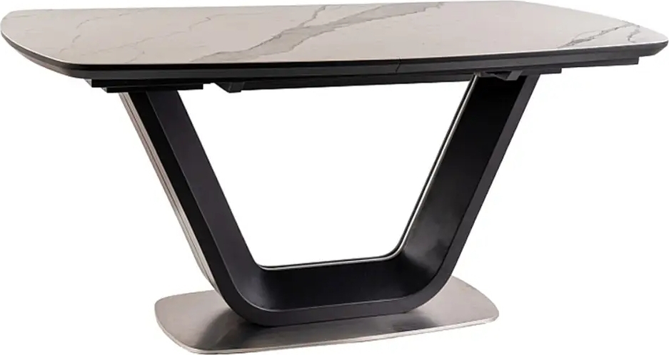 Uttrekkbart spisebord i tre, metall og børstet stål. Keramisk bordplate med marmoreffekt.