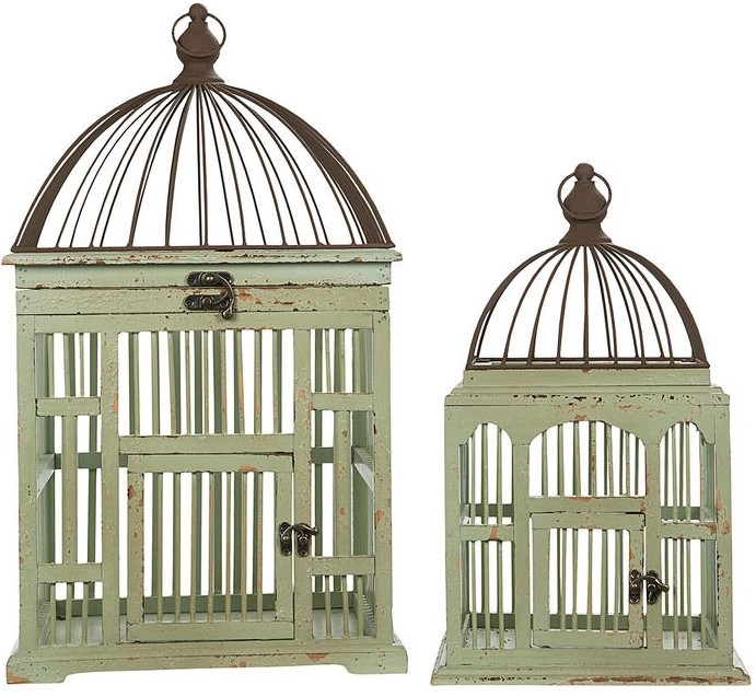 Ett par klassiske fuglebur i tre og metall.