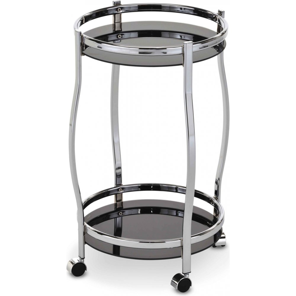 En tradisjonell serveringsvogn med et moderne design. Laget i forkrommet metall med to bordplater i herlig svart glass. Bordet er lettplassert og kan også anvendes som eksempelvis sidebord eller lampebord. Denne serveringsvognen er ment som dekorasjon og bør maksimalt belastes med en vekt på 30 kg.