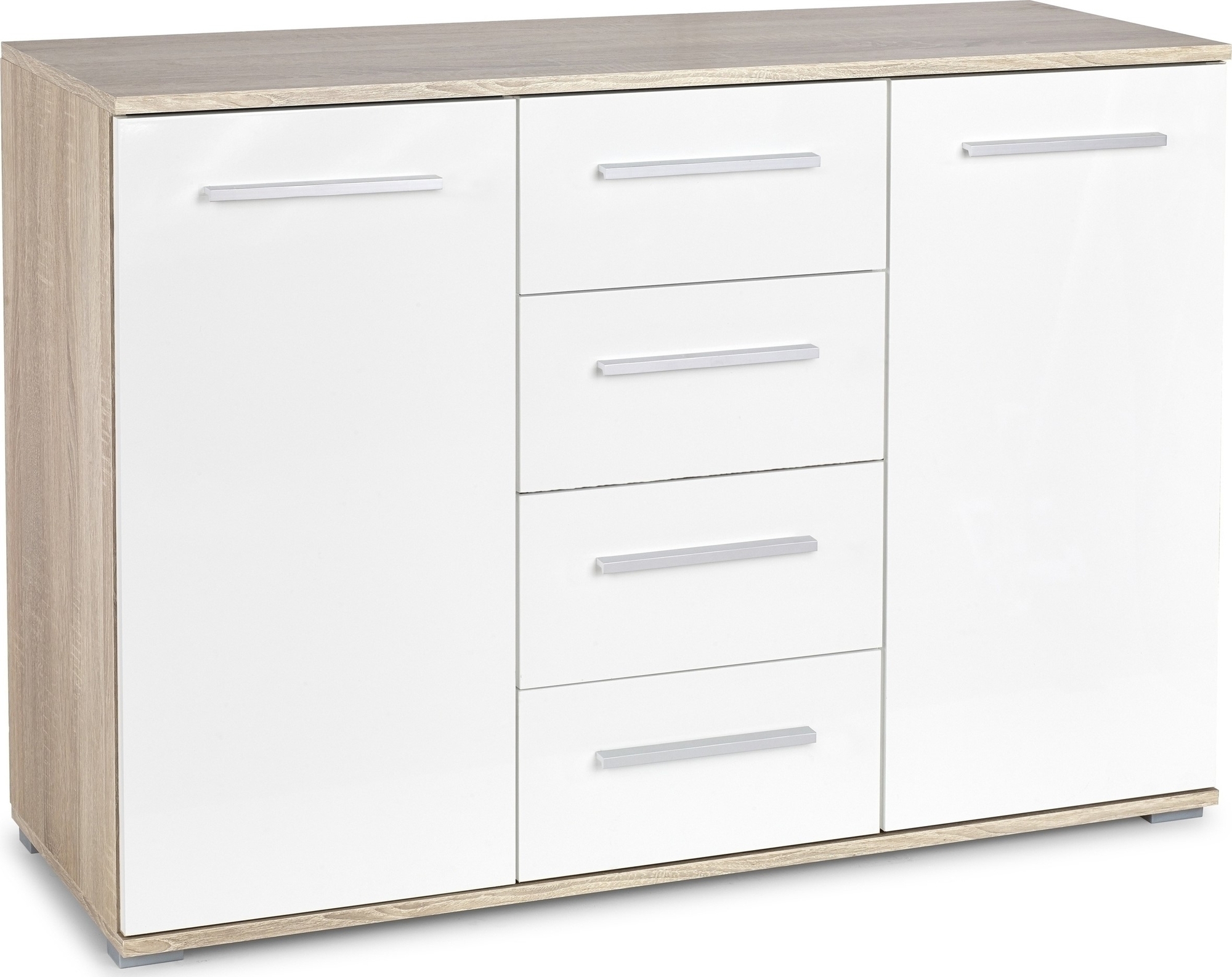 En stilren byrå med herlig design. Tilvirket i hvit MFP (premium treplate) og eik laminat. Fire romslige skuffer og to store skap for praktisk oppbevaring. Byråen passer perfekt inn på flere ulike plasser i husholdningen.