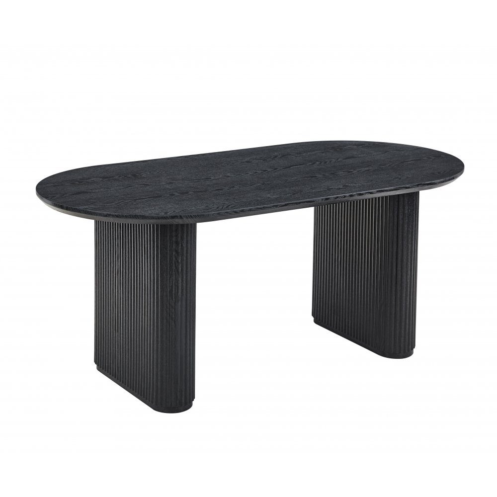Callum spisebord i moderne design med bordben i rillet treverk. Bordplaten er laget av MDF-tre med svartbeiset eikefiner. Spisebordet har plass til 4-8 personer.