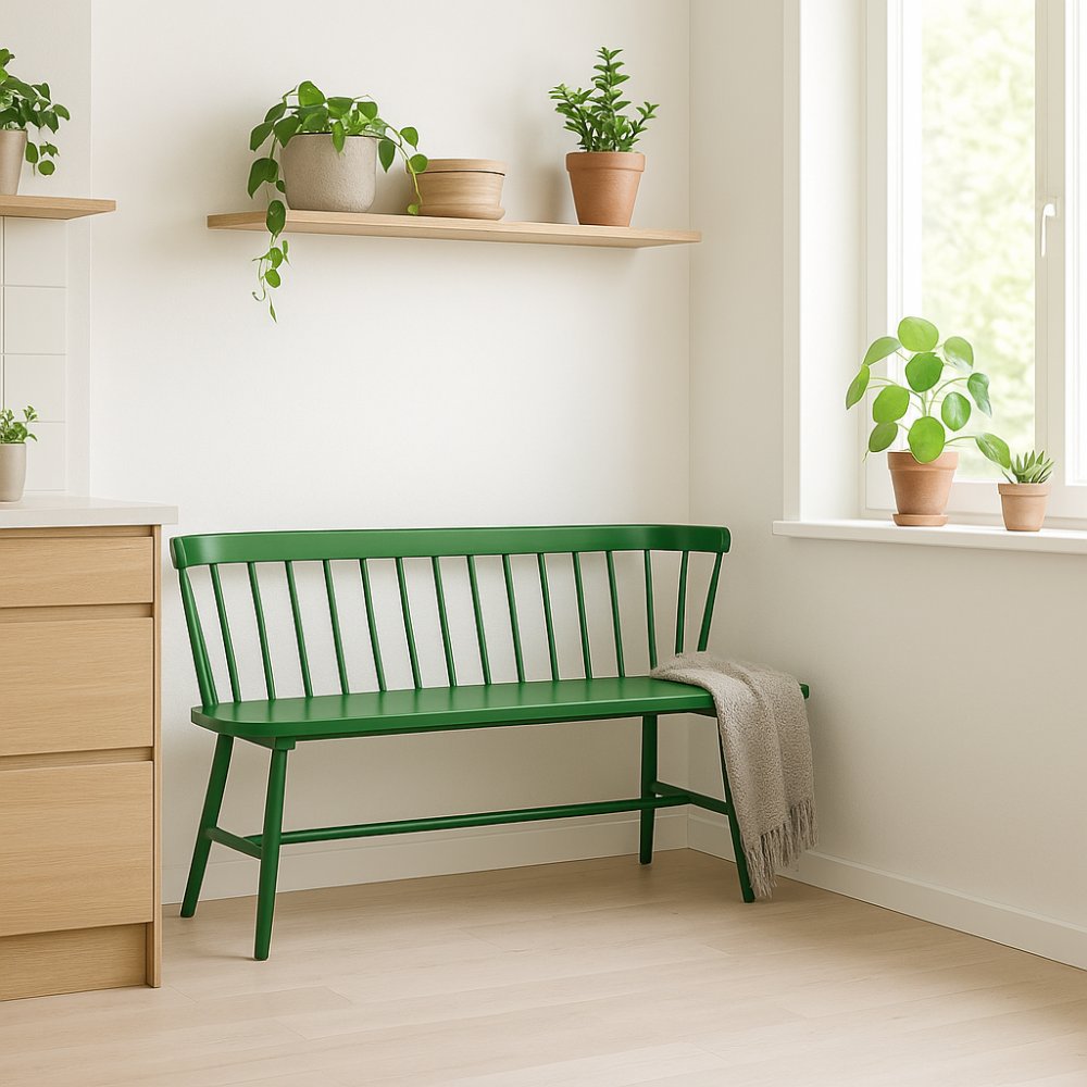 Sandhamn grønn pinnesofa i kjent retrodesign. En klassiker i grønnlakkert heltre. Fargekode RAL6001