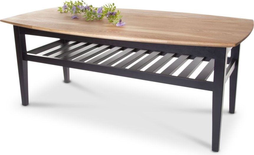 Cardiff gir deg et sofabord i moderne og stilrent design, med bordskiven i massiv oljet eik og svartlakkert understell. Praktisk hylle under for ekstra oppbevaring.