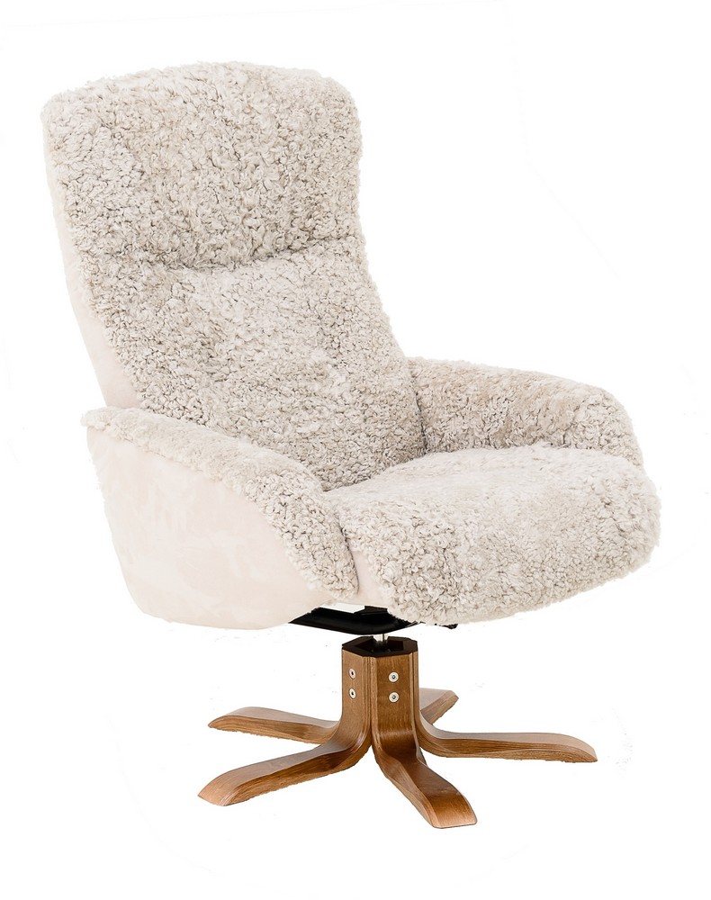 Stilig lenestol kledd i valgfri farge på saueskinn som kan matches med valgfrie bein. En lenestol som gjør seg bra i de fleste hjem. Fotskammel kan også kjøpes utenom.