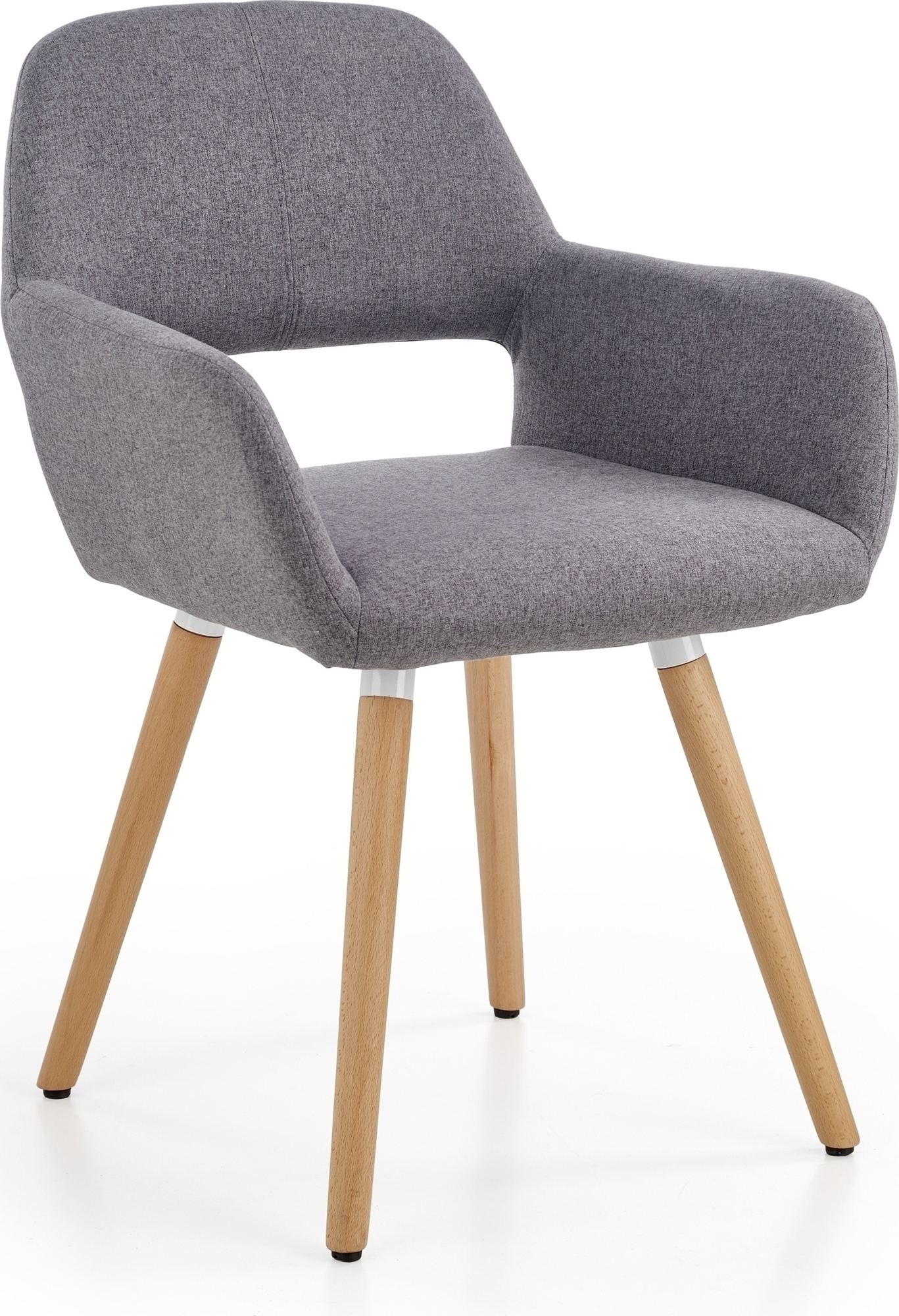 En herlig spisestol med moderne design. Spisestolen er tilvirket av solid tre med den naturlige tre finishen på beina, og setene er trukket med et veldig behagelig tøystoff for maksimal komfort.
