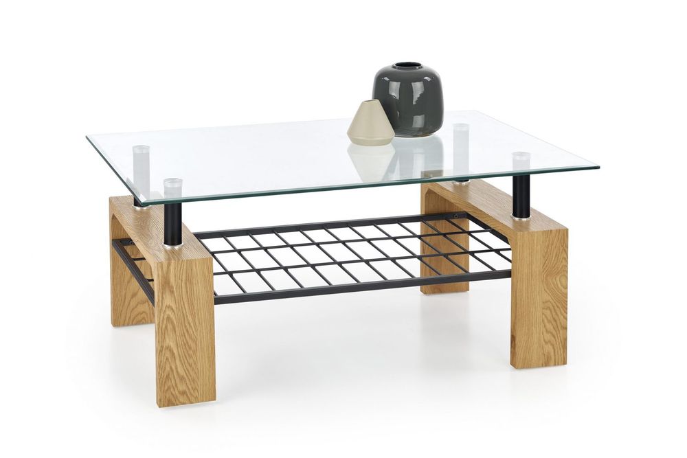 Et fint sofabord med et moderne design. Bordplaten er produsert av meget solid klarglass med en underhylle i pulverlakkert metall og beina er av MFP (premium treplate) med en herlig finér.