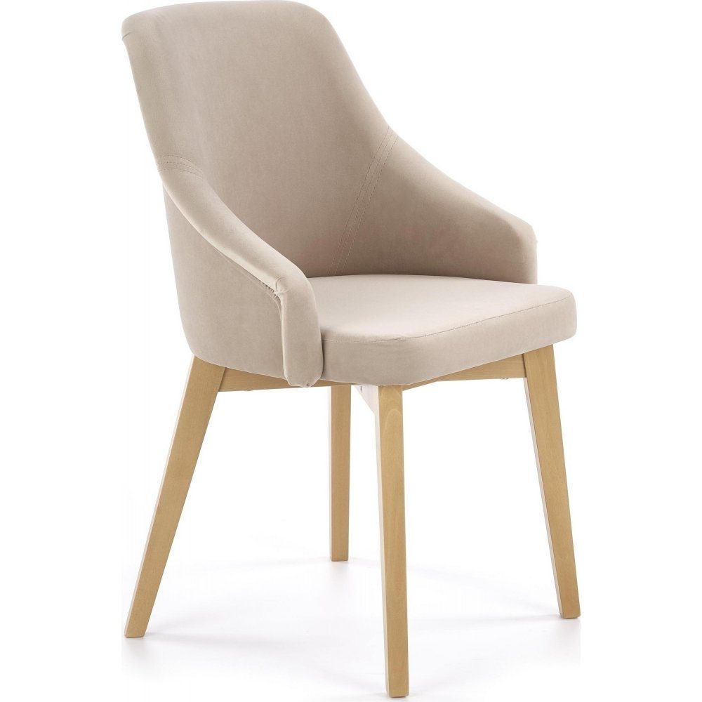 En pen spisestol med moderne design. Stolen er kledd med et veldig behagelig stoff for maksimal komfort og understellet er tilvirket av solid tre med dens naturlig tre finish.