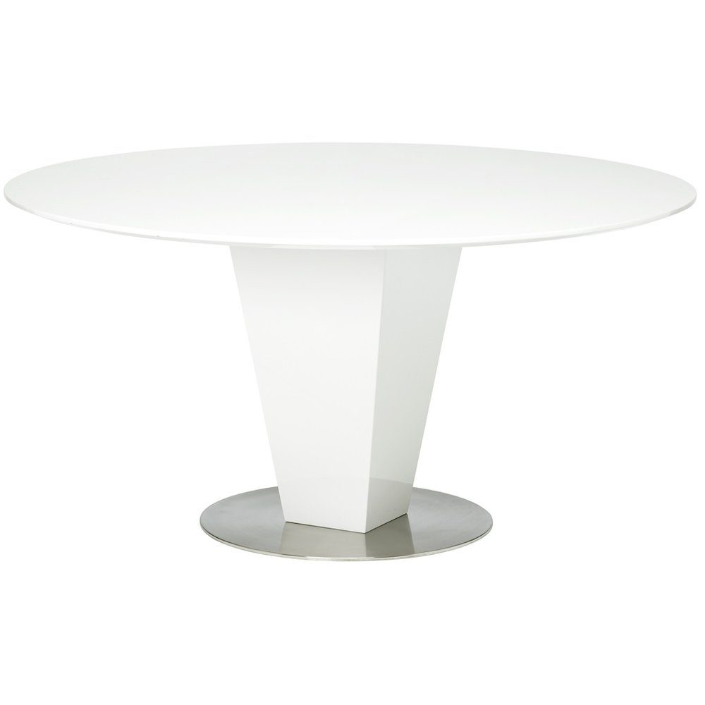 Stilrent og stort, rundt bord i hvit høyglans med en fot i børstet rustfritt stål. Hele 150 cm i diameter!