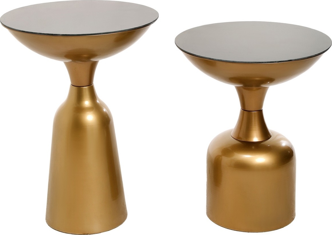 Sidebord laget av metall med bordplate i speilglass malt mørkegrå. Består av 2 uavhengige tabeller.