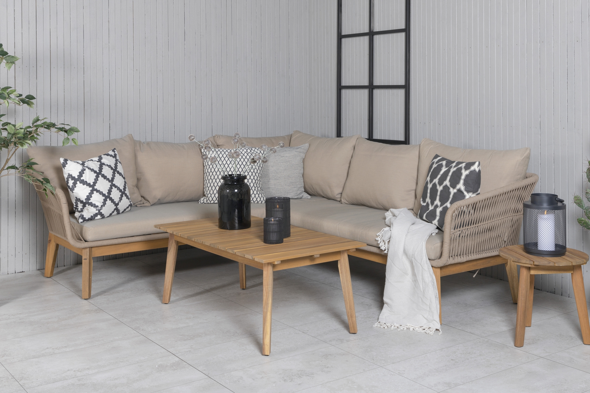 Vakker og stilig gruppe laget av vakker akasie, lattefarget/brunt stål og flettet tau i en naturlig farge. Tilhørende bord er gjennomgående i akasie, noe som skaper en stilig helhet. Slitesterke puter i beige er inkludert og gruppen har plass til totalt 5 sittende gjester. Inviter til mange hyggelige stunder i sommer.
