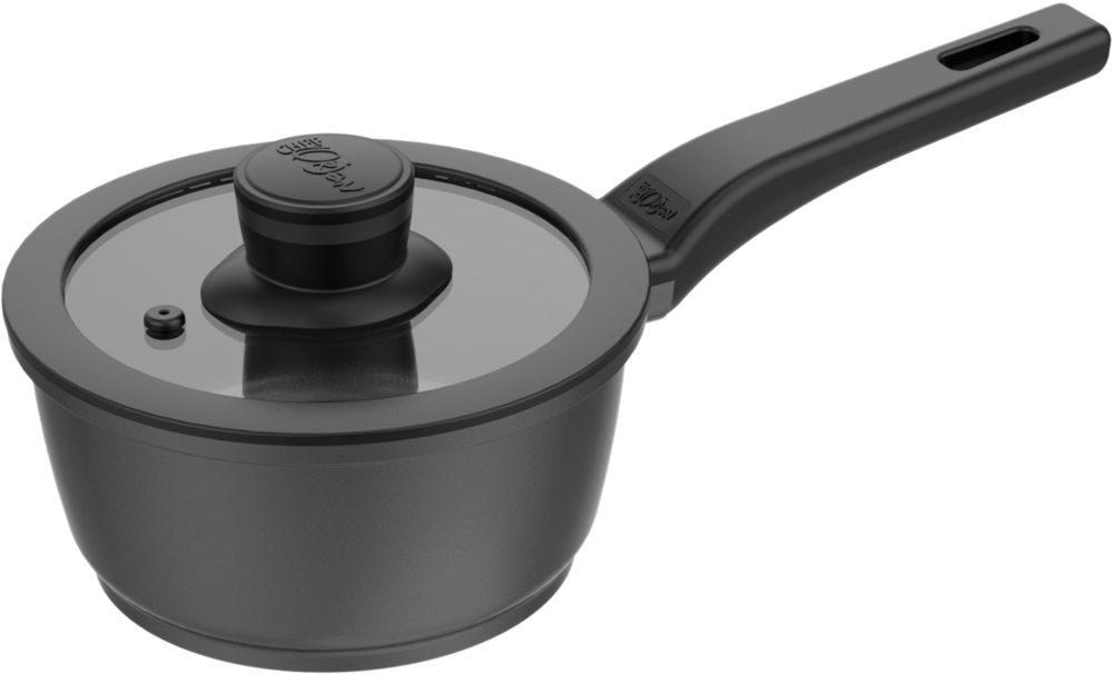 Moderne kaserolle i svart, laget av aluminum. Glasslokk.