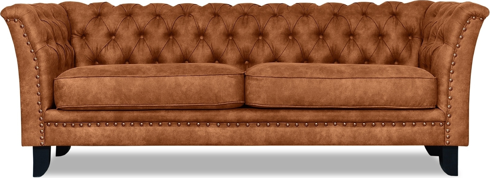 Polstringen består av både kaldt skum og møbelvatt på toppen for å gi så behagelig komfort som mulig. Messingdesignet dekorasjonsnagler sitter på forsiden av rammen som en stilig detalj. Svartlakkerte treben egnet for sofaens design.