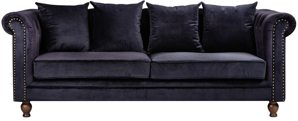 Stilig sofa kledd med et svart fløyelstoff. Dekorative nagler foran. Stammen er av massivt tre.