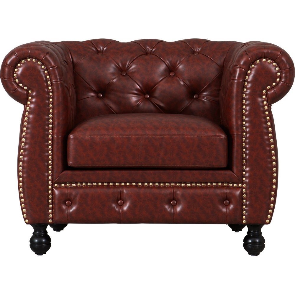 Klassisk Chesterfield lenestol med innsydde knapper og nagler. Polstring i myk brun PU med sorte ben.