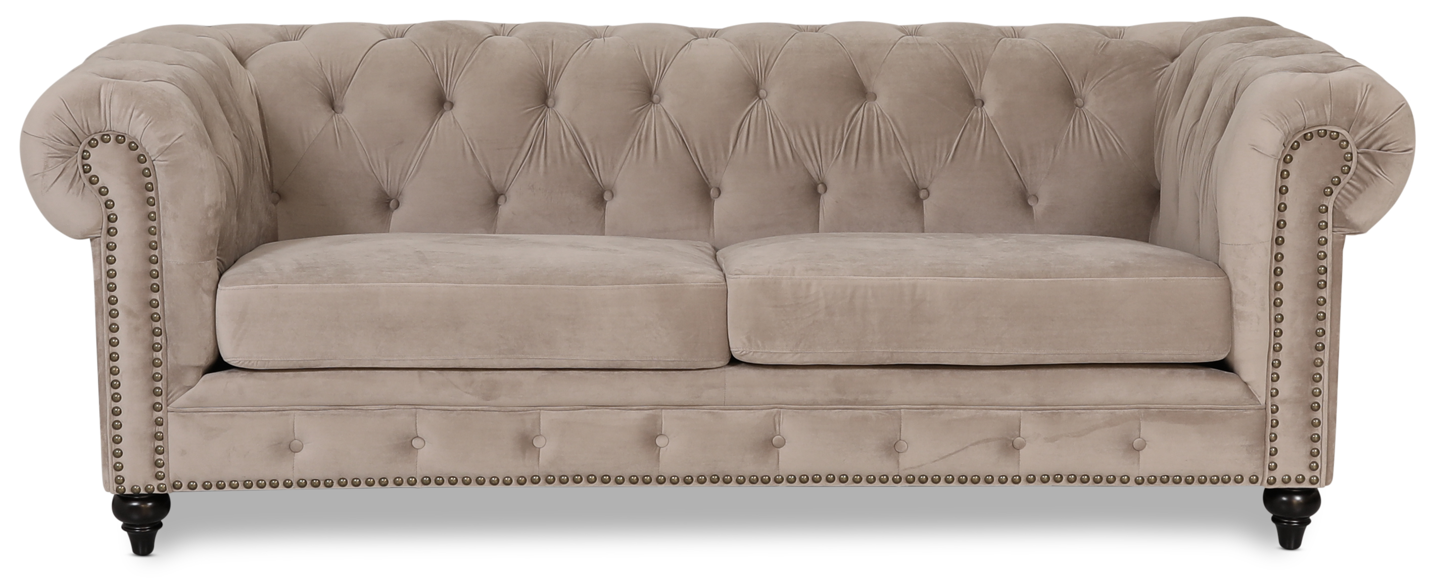 Montgomery chesterfieldsofa gir deg et høykvalitets møbel med utsvingte detaljer. Kledd med et beige sammetstyg. Kobberfargede nagler på fremsiden av sofaen og svarte ben. Begge sitteputene er avtakbare og har pocketfjær og skumstopning for høy komfort og lang holdbarhet.