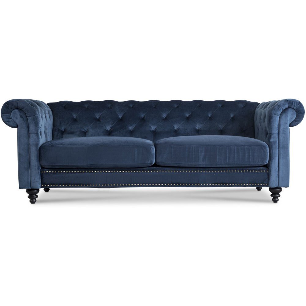 Chesterfield Royal 3-seters sofa i et mørkeblått mykt og deilig fløyelsstoff, med herlig komfort og god kvalitet. Sitteputene er fôret med kaldskum med duntopp for å gi lang holdbarhet! Sofaen er rettvinklet på baksiden, hvilket gjør den perfekt til å settes mot en vegg. Svarte dreide trebein. Antikkfargede nagler som dekorasjon på forsiden av sofaen.