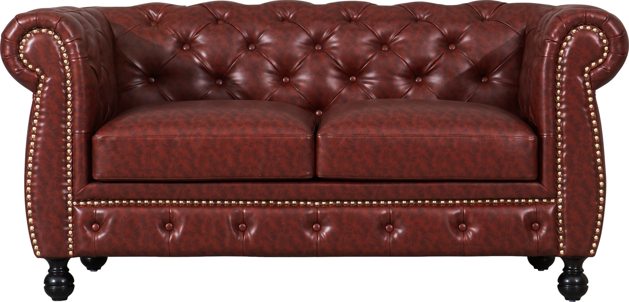 Klassisk Chesterfield sofa med innsydde knapper og nagler. Polstring i brun myk PU med sorte ben.