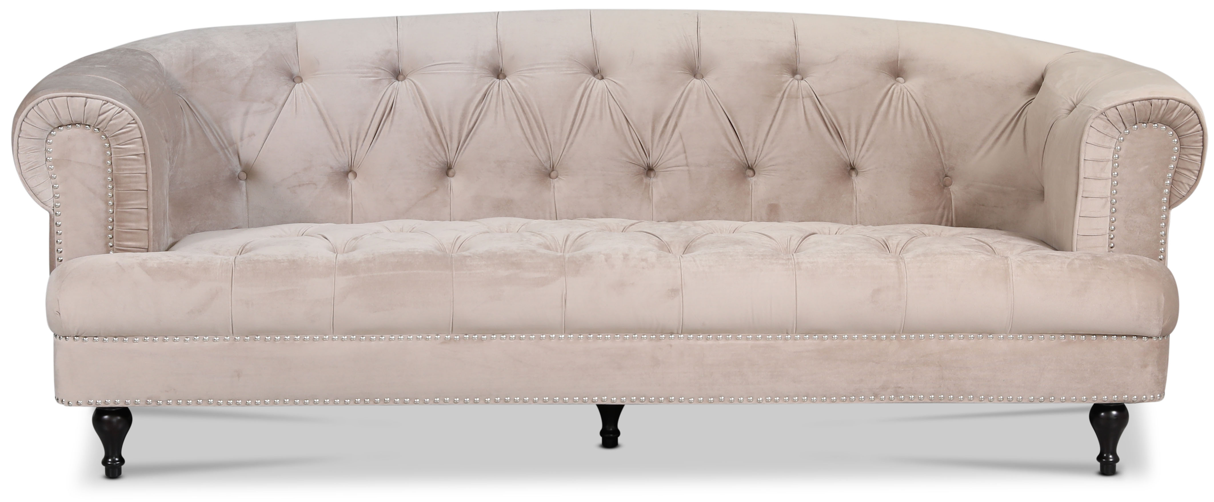 Winston er en chesterfieldsofa i myk beige fløyel med nagler i forkrommet metall. Kaldskum og fiber i ryggen og setet for å gi et høyt komfortnivå. Forkanten av sofaen er dekorert med kromfargede nagler. Massive svartlakkerte treben.