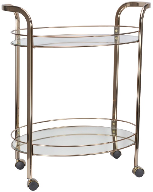 En tradisjonell serveringsvogn med et mykt og avrundet utseende. Serveringsvognen har to hyller i herdet glass.