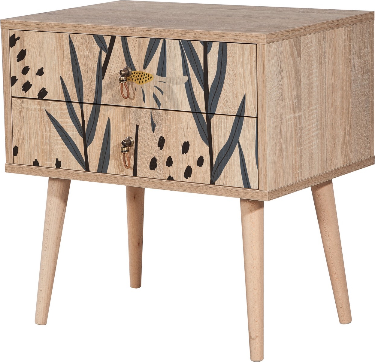 Nattbord av sponplater med ben i heltre.