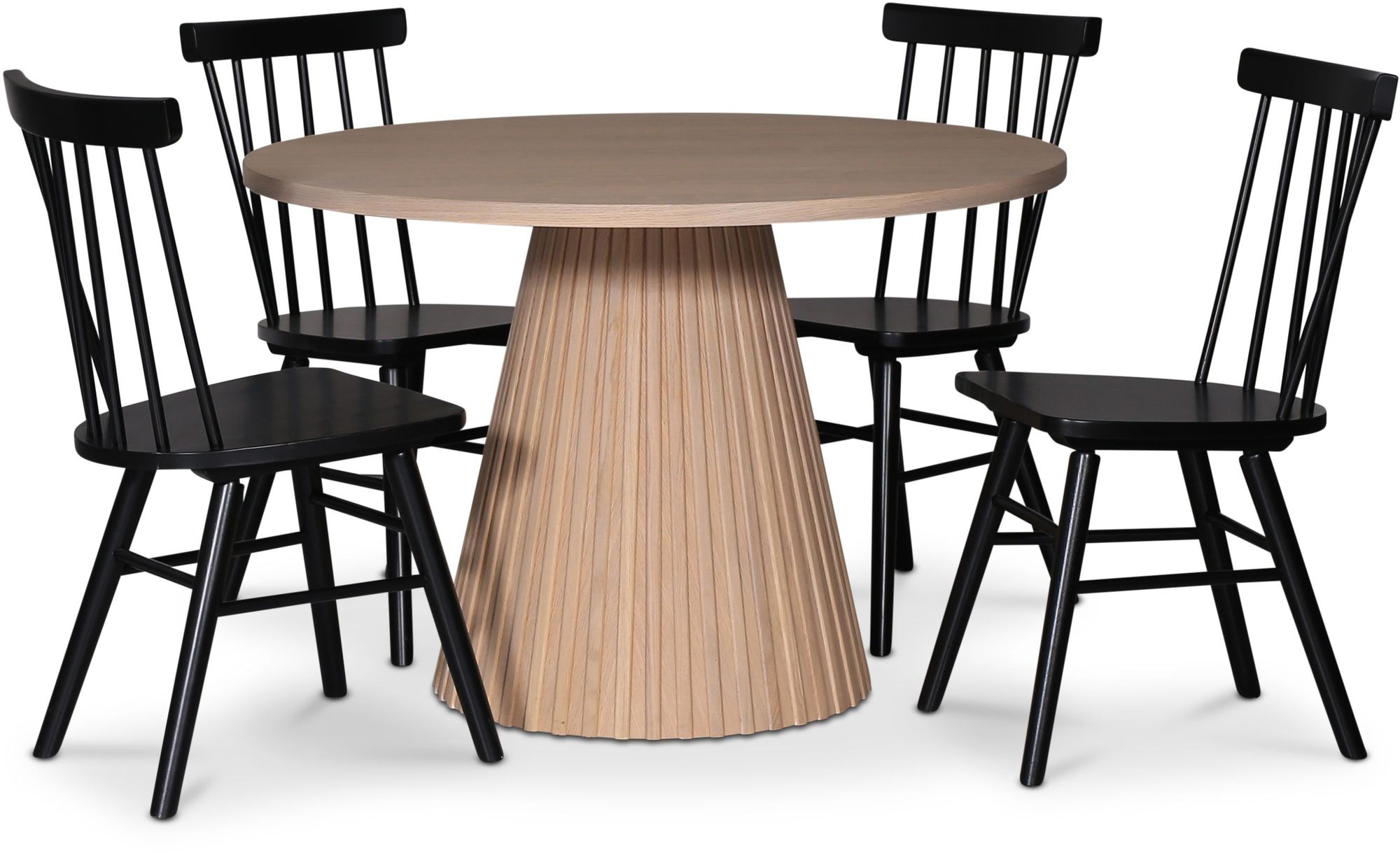 Cleo spisegruppe, rundt bord 110 cm, inkludert 4 stk. svarte Orust pinnestoler - Whitewash/eikefine