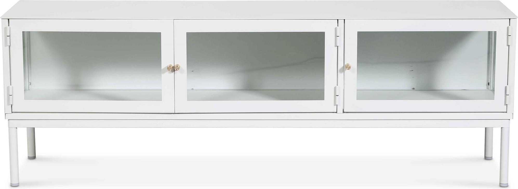 Skandinavisk design med rene linjer. Cliff mediabenk i hvit sandlakkert metall med klarglass og håndtak i matt messing. 3 st dører med klarglass og også klarglass på sidene som slipper lyset inn i skapet.