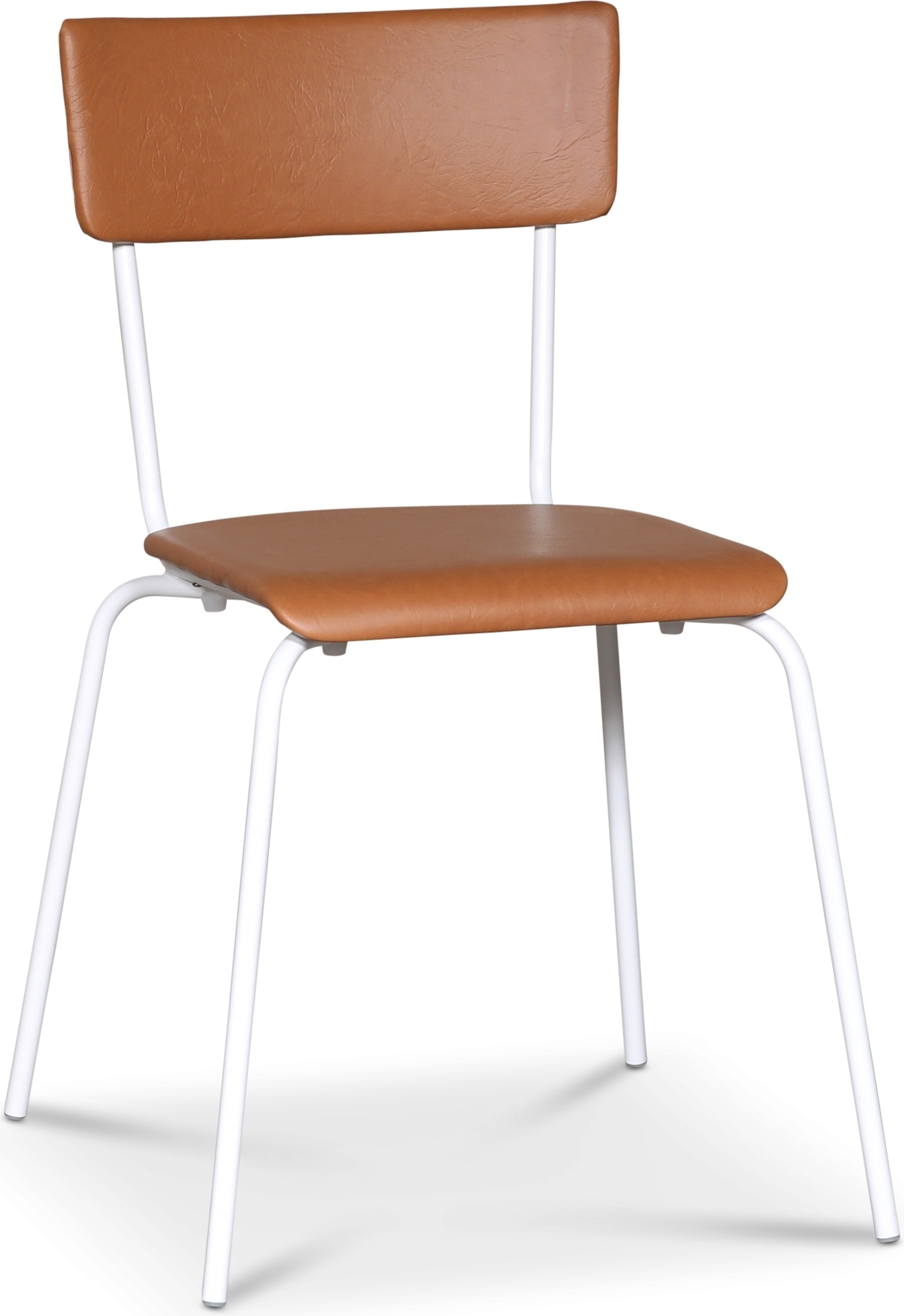 Cliff spisestuestol en moderne møbelklassiker som aldri går ut av tiden. Hvitlakkerte metallben med brun PU i sete og rygg. Messingdetaljer og stabelbar stol.
