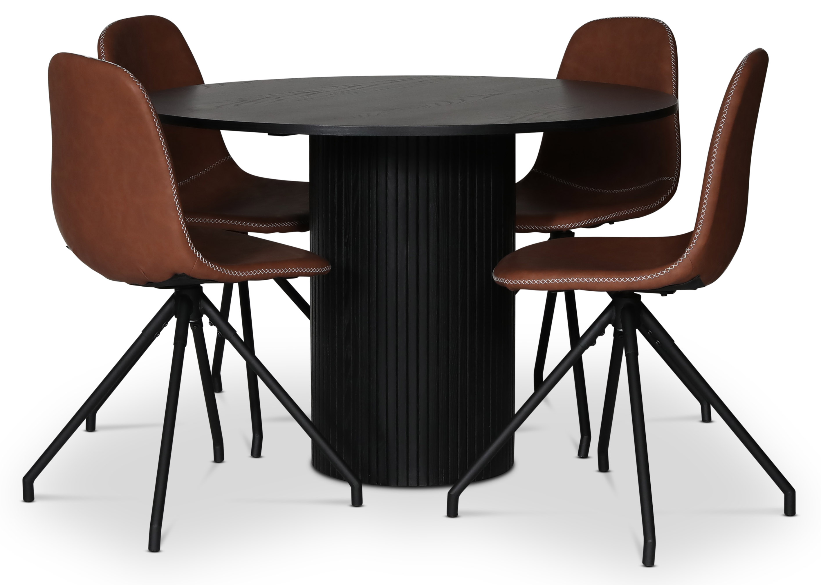 Cobe spisegruppe fra Skånska Möbelhuset, rundt spisebord 110 cm i diameter, i svartbeiset eikefiner med fire Bridge spisestoler i brun vintage PU med svart metall ben.