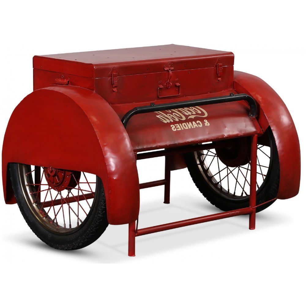 Vintage vogn av rødfarget metall på gummihjul. en orginal form for oppbevaring og en dekorasjon til hjemmet.
