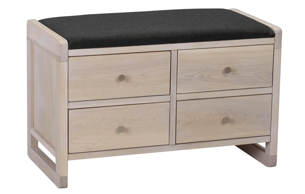 Confect benk i massiv hvitpigmentert eik. Fire skuffer som gir godt med oppbevaringsplass. Confect benk fungerer både som sitteplass og oppbevaring i entréen. Benken inngår i vår entrémøbelserie Confect.