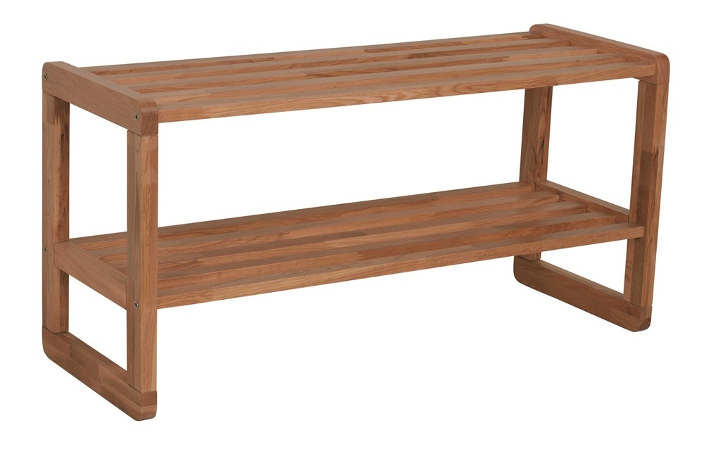 Confect skostativ i massiv eik. Stabilt og stilrent skostativ i to nivåer med avrundede hjørner. skandinavisk entréserie Confect.