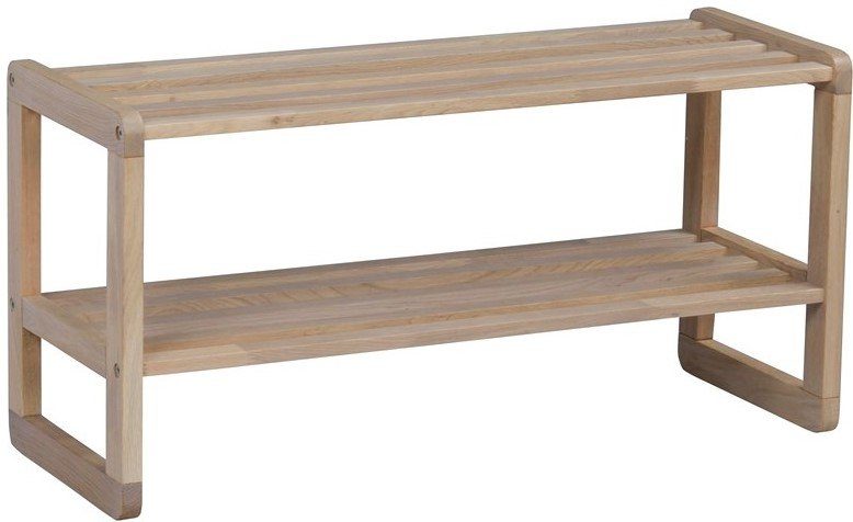 Confect skostativ i massiv hvitvasket eik. Stabilt og stilrent skostativ i to nivåer med avrundede hjørner. Inngår i vår entrée-serie Confect.