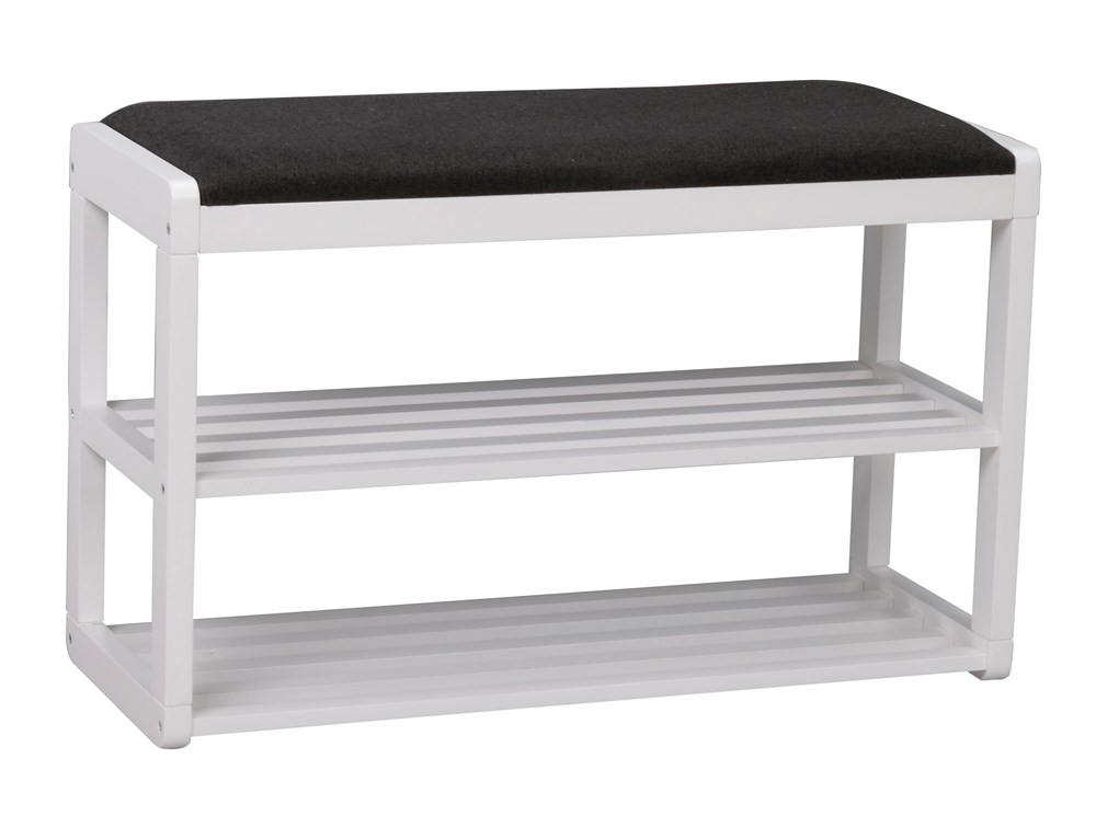 Stilrent og praktisk skostativ og sittebenk i ett. Massiv hvitlakkert bjørk og hvitlakkert MDF. Skostativet har to hyller samt en herlig mørk grå sittepute. Inngår i vår serie Confect.
