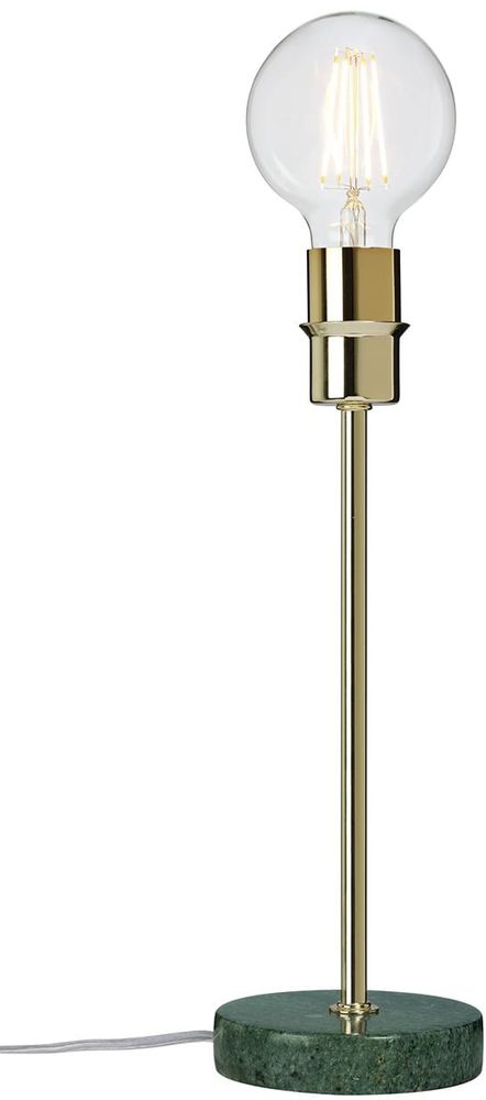 En fleksibel bordlampe med en moderne design. Foten er tilvirket av grønn marmor og halsen er av forkrommet metall.