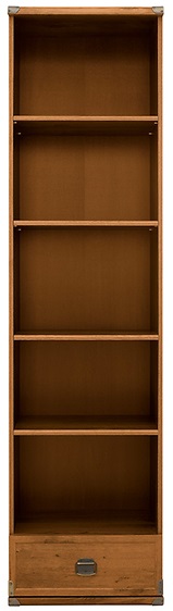 En fin bokhylle i kolonistil med dekorative metallhåndtak og metallbeslag. Bokhyllen har mange hyller og en skuffe lengst nede for mindre ting, hvilket gjør den svært funksjonell.