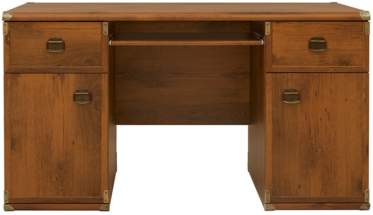Et stødig skrivebord i kolonialstil med metallbeslag og metallhåndtak. Nederst er det en vannrett plate som beskytter veggen fra smuss og stabiliserer skrivebordet. Det er store oppbevaringsmuligheter med to skap og to skuffe, samt en tastaturhylle som gjør at du slipper å ha unødvendige ting på bordplaten.