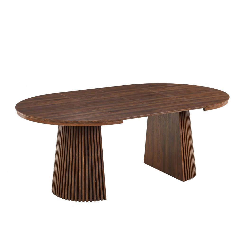 Crossby rundt spisebord i moderne design med bordben i rillet treverk. Bordplaten er laget av MDF-tre med valnøttfiner.
