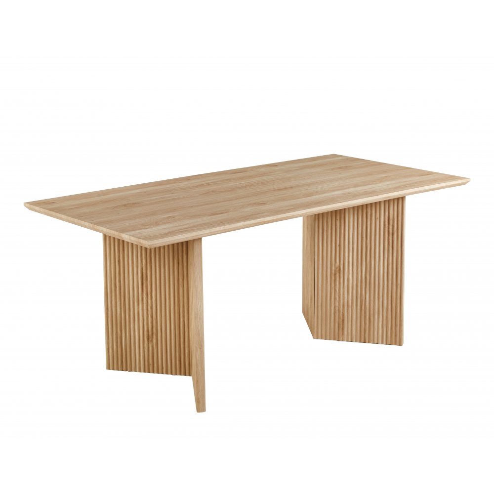 Crossby spisebord i moderne design med bordben i rillet treverk. Bordplaten er laget av MDF-tre med eikefiner. Spisebordet har plass til 4-8 personer.