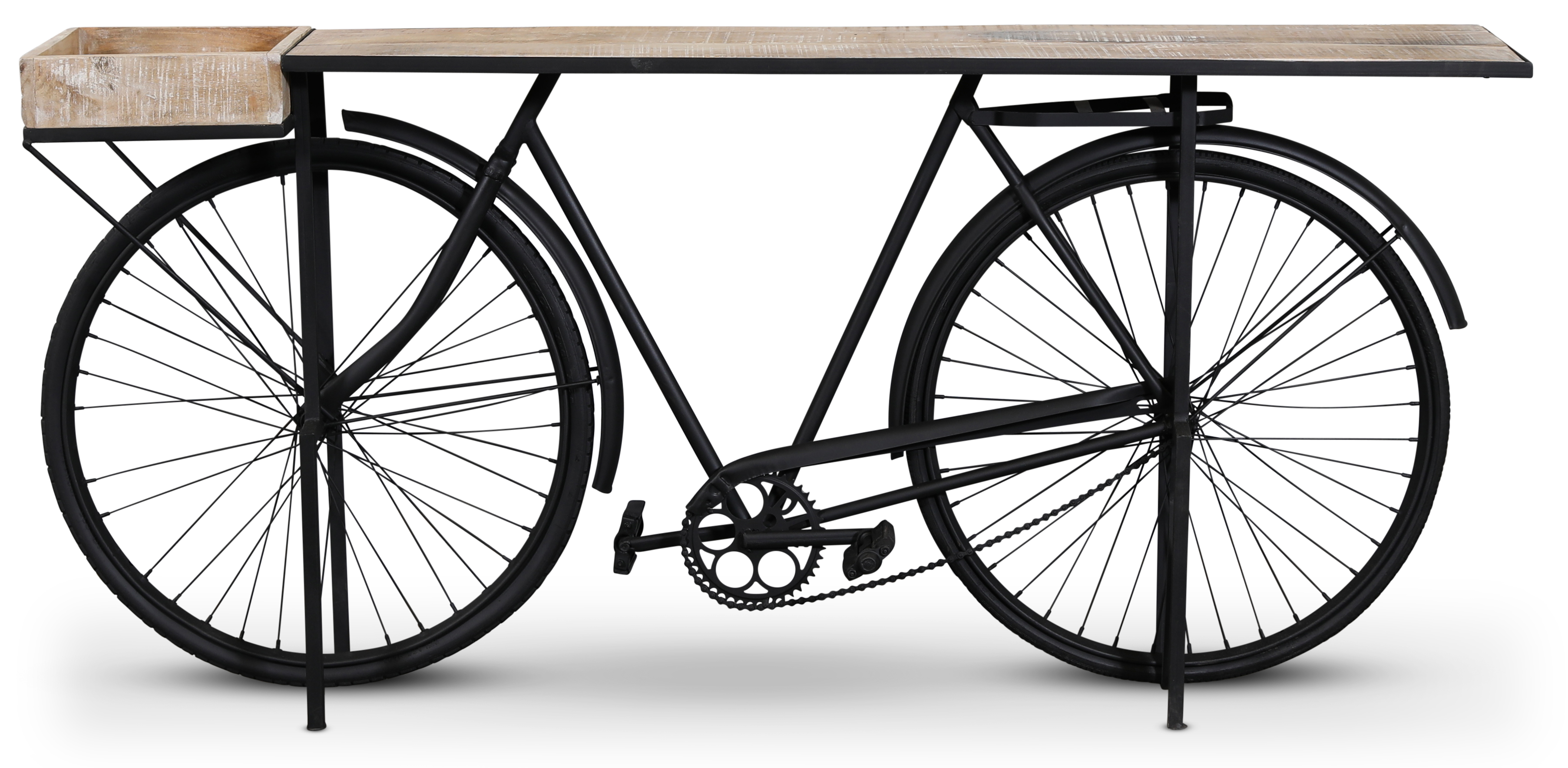 Barbord i form av en svart sykkel. Laget av metall med topplate og skuff av mangotre. Gummihjul på sykkelen. Finnes også i hvitt.