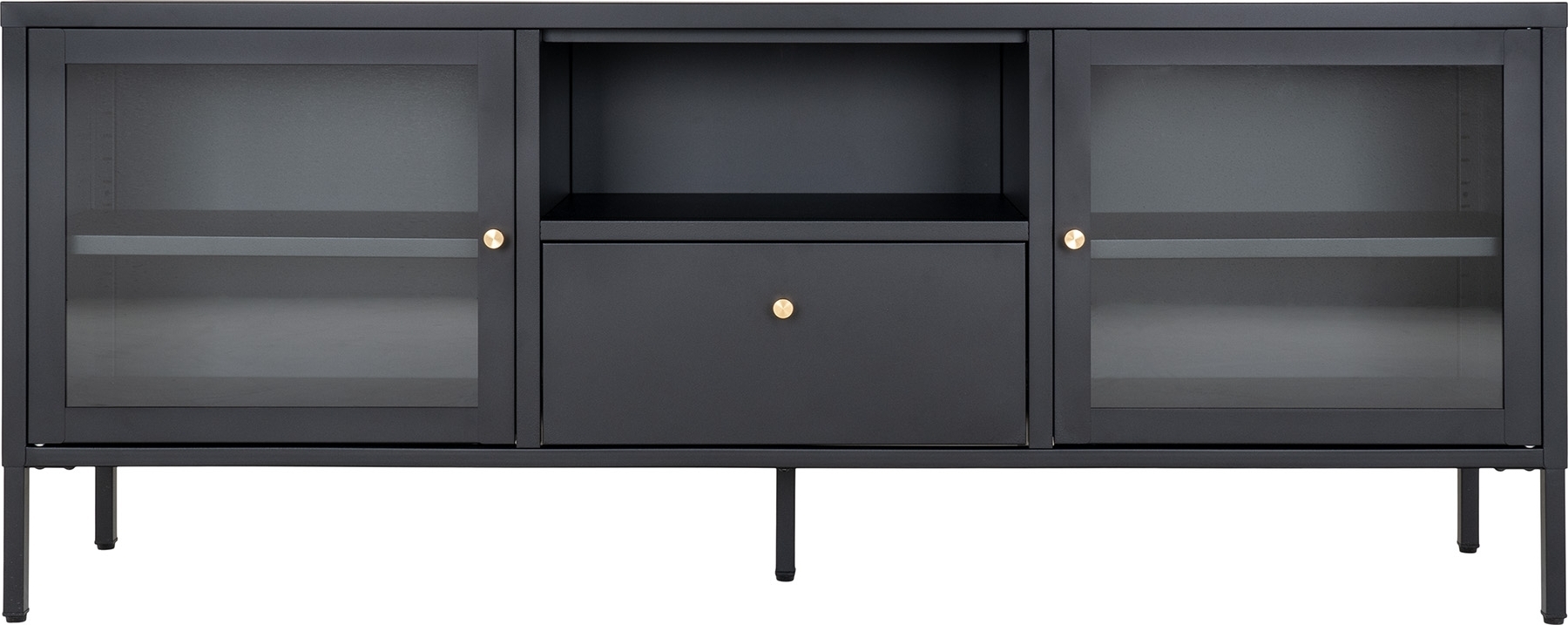 Mediabenk i stål med glassdører.