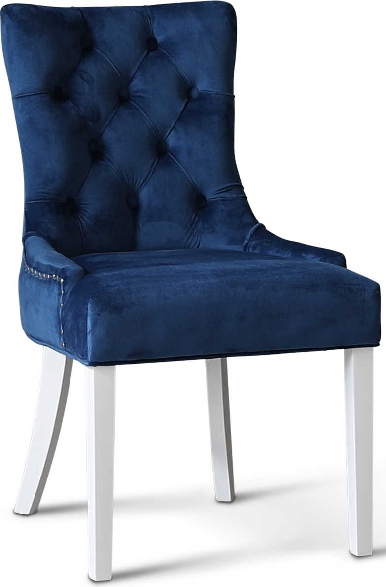 Dalsland spisegruppe med rundt spisebord med oljet eikeplate og hvitlakkert understell. 4 stk Tuva stoler i blå fløyel.
