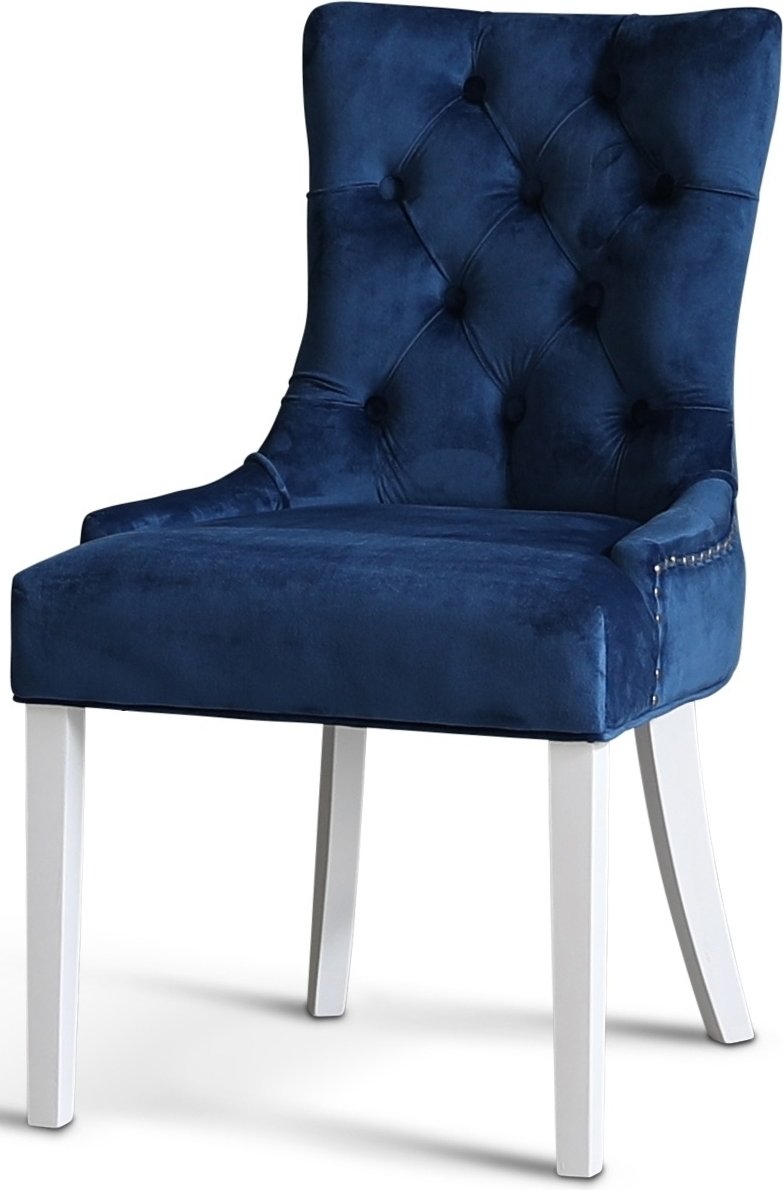 Dalsland spisegruppe med rundt spisebord med oljet eikeplate og hvitlakkert understell. 4 stk Tuva stoler i blå fløyel.
