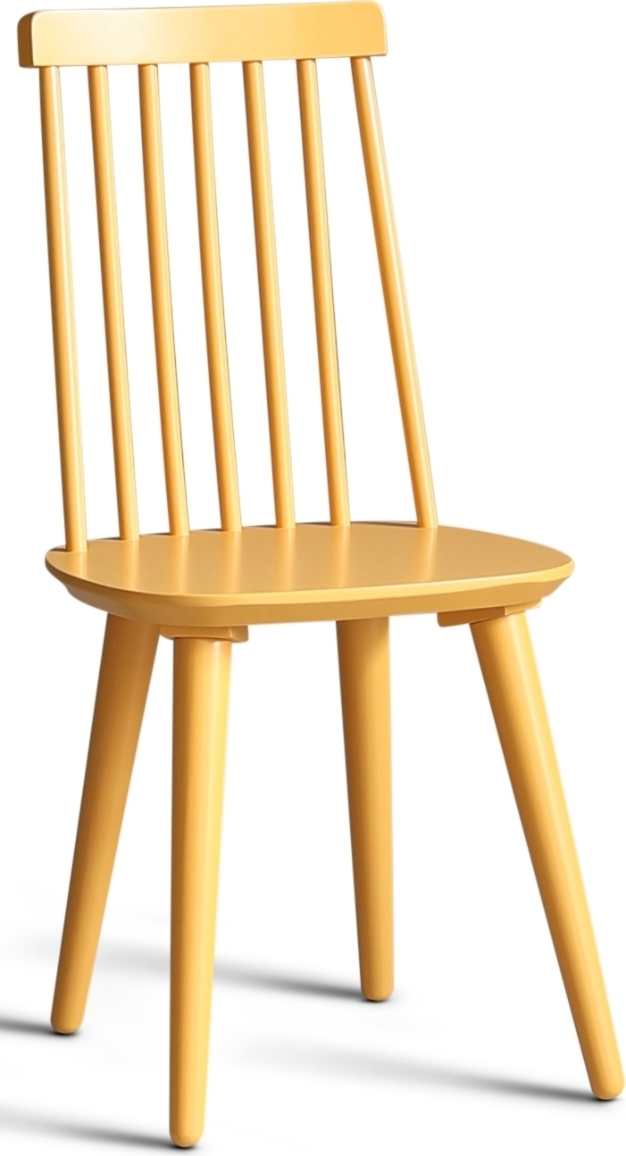 Dalsland spisegruppe med rundt spisebord med oljet eikeplate og hvitlakkert understell. Dalsland utkragende stoler i en deilig gul lakk (RAL1032)