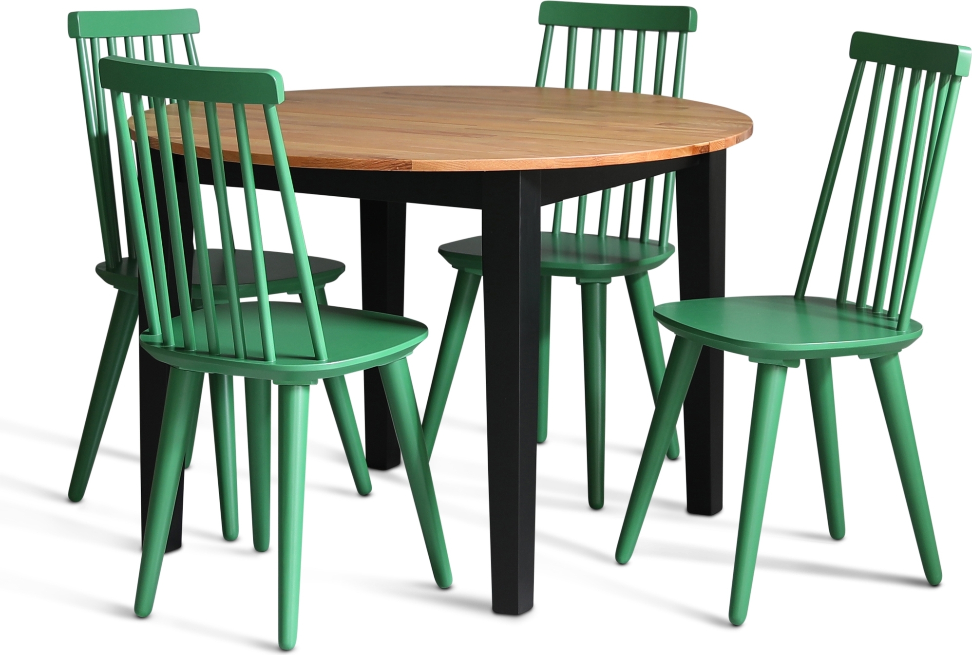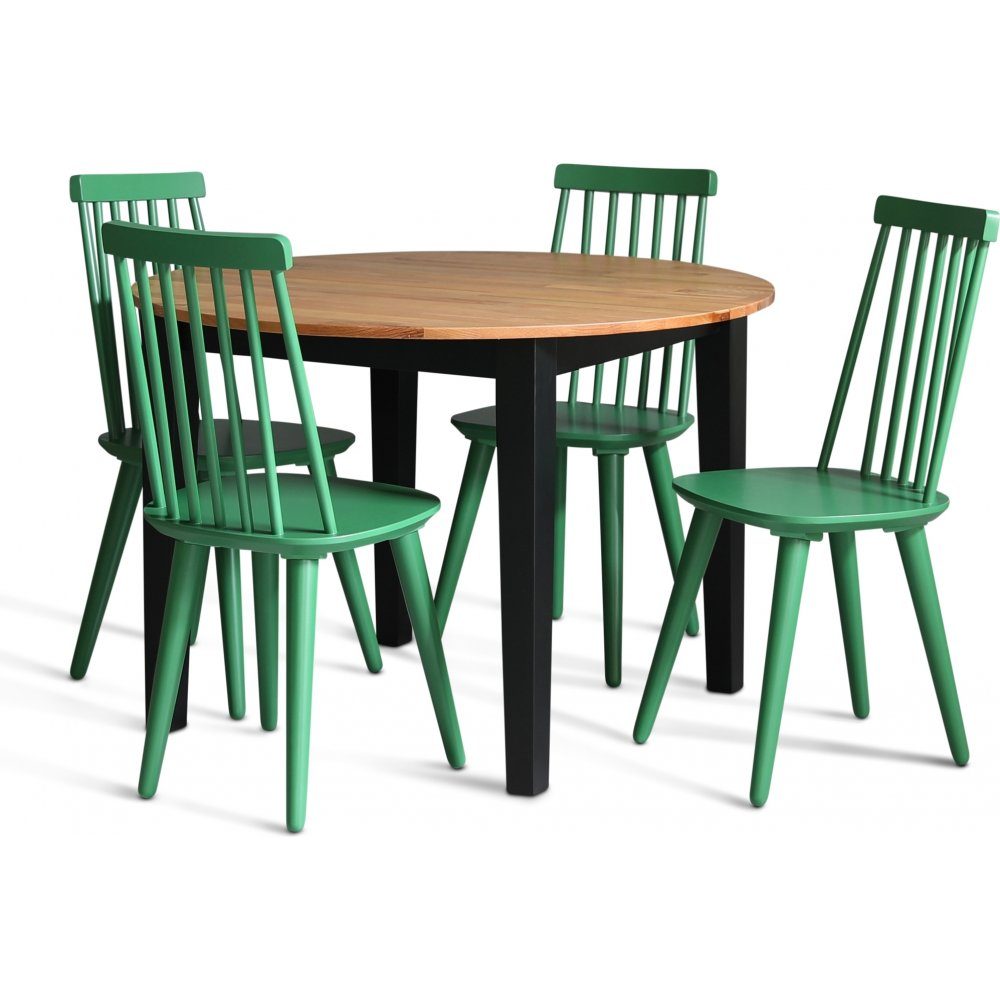 Dalsland spisegruppe med rundt spisebord med oljet eikeplate og sortlakkert understell. Dalsland utkragende stoler i deilig grønn lakk (RAL6001)